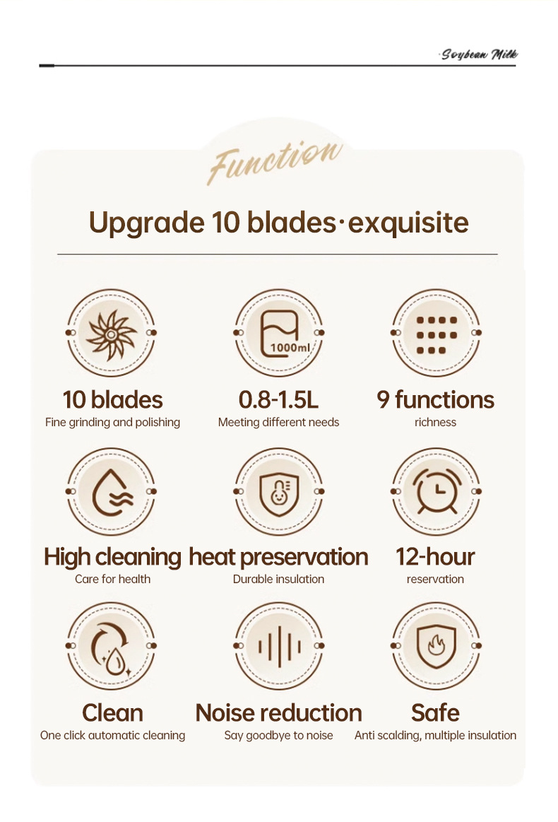 This fully automatic soy milk maker is a compact and multifunctional household appliance, also serving as a mini blender and food processor. It features an advanced no‑filter design for smooth and delicate soy milk, saving time and cleaning effort.